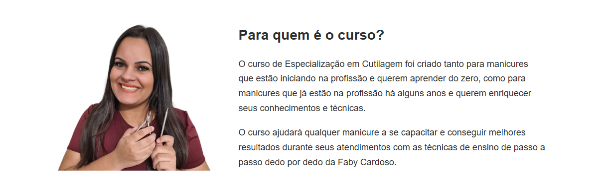Faby Cardoso, uma das grandes referências do setor, ensina técnicas atualizadas de manicure e pedicure, com ênfase no atendimento ao cliente e no uso de ferramentas digitais para promover os serviços. Ao aprender as técnicas e como aplicá-las no ambiente digital, os alunos podem aproveitar as ferramentas de marketing digital para alcançar um público maior, aumentar a visibilidade e conquistar mais clientes.